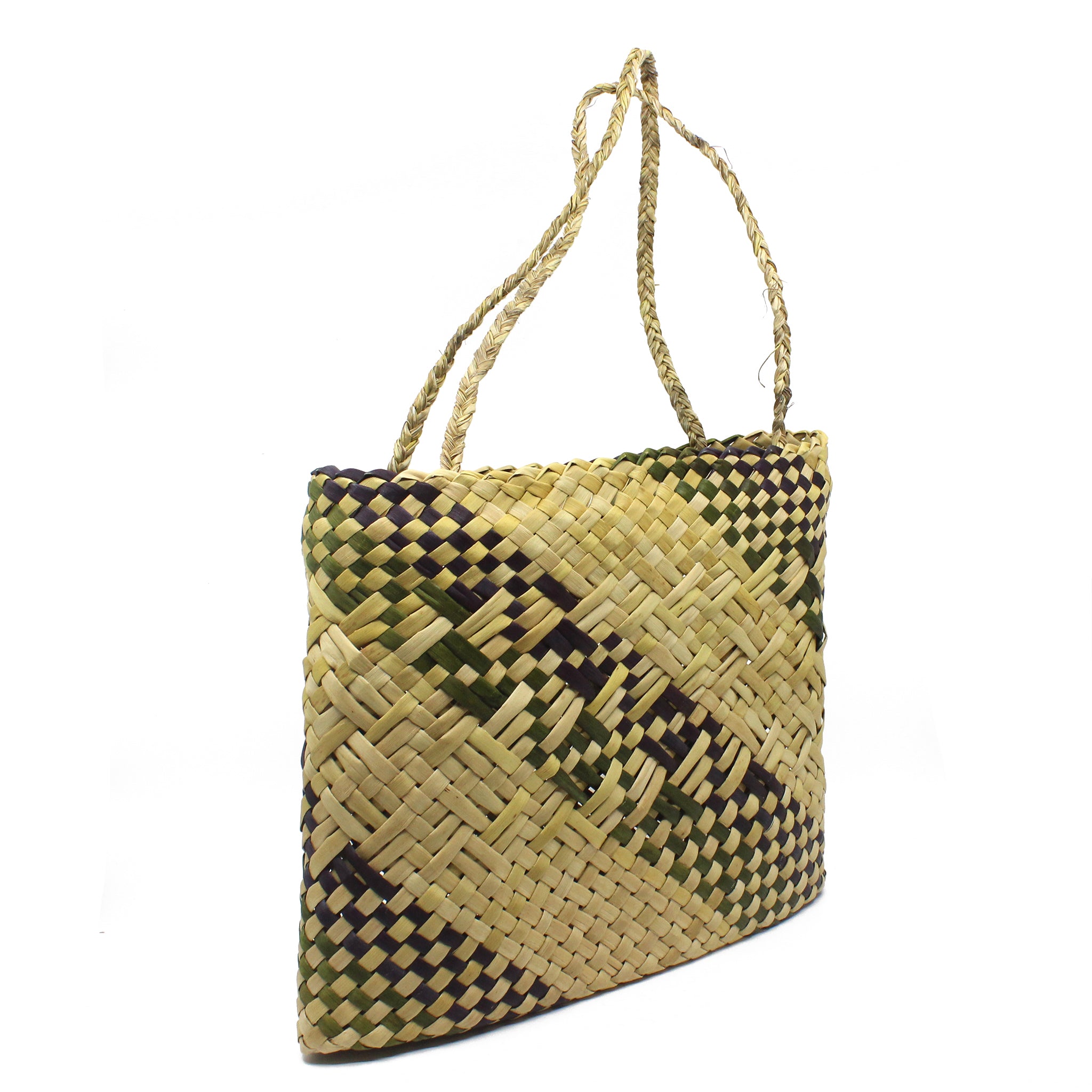 This beautiful Kete whakairo (patterned woven bag) was woven by Riperata McMath using Harakeke.