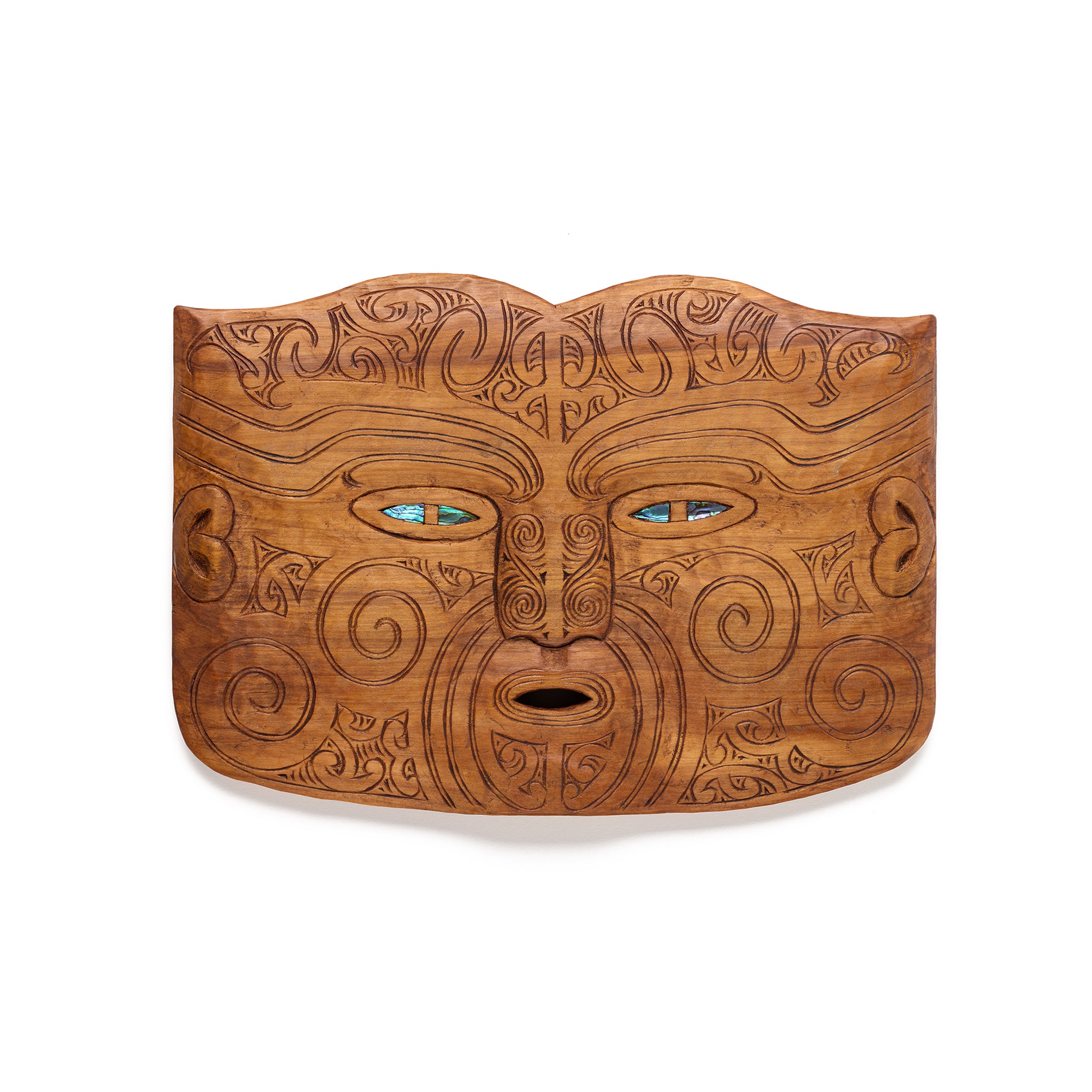 This is a hand carved Koruru made from Rimu wood by Tim Codyre. It features a full face moko (Māori tattoo) embellished with pāua shell for the eyes.